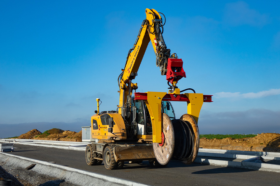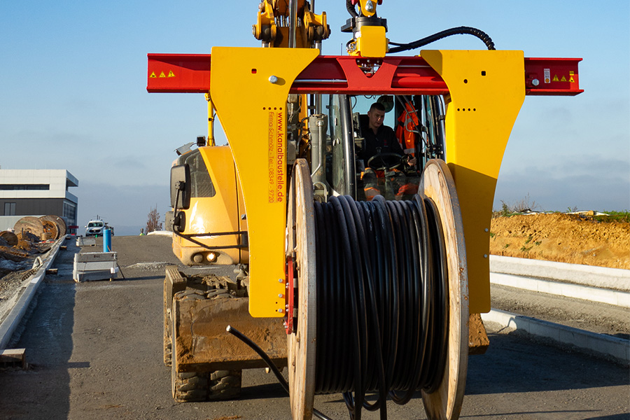 Der KabelFIX ist die Innovation im Bereich Kabeltiefbau und Netzbau und bietet große Vorteile zur herkömmlichen Methode mit Kabelanhängern. Die Kabeltrommel wird vom Baumaschinenführer mit den beweglichen Armen des vollhydraulischen Anbaugeräts in die Zange genommen und an die gewünschte Position gebracht. Durch den ebenfalls hydraulisch angesteuerten 360°-Drehmotor ist es möglich die Kabeltrommel direkt über dem Verlegegraben zu halten, während der Bagger seitlich des Grabens steht. Mit einem weiteren Drehmotor wird die Trommel in Drehung versetzt. Die Drehgeschwindigkeit kann dabei feinfühlig per Joystick gesteuert werden und an Ihr Arbeitstempo angepasst werden.