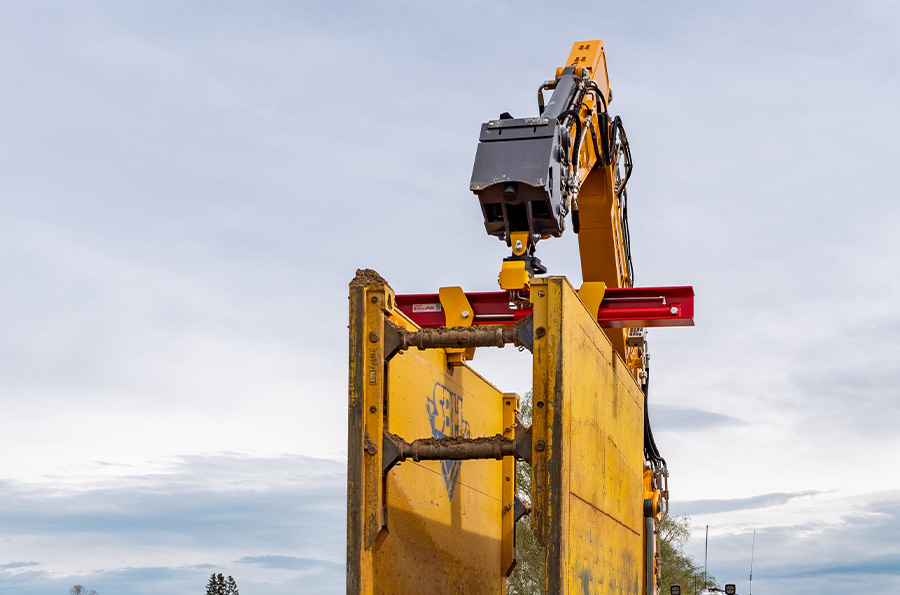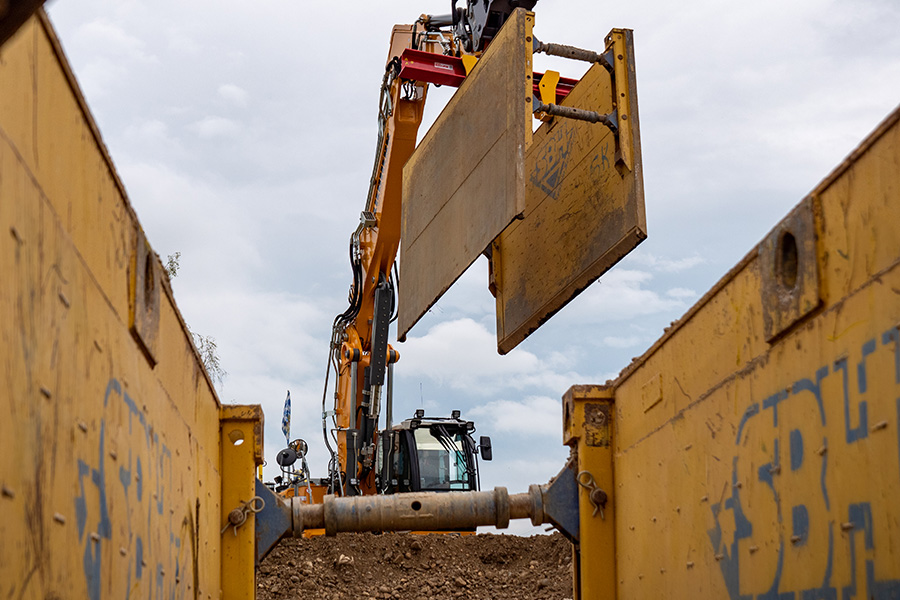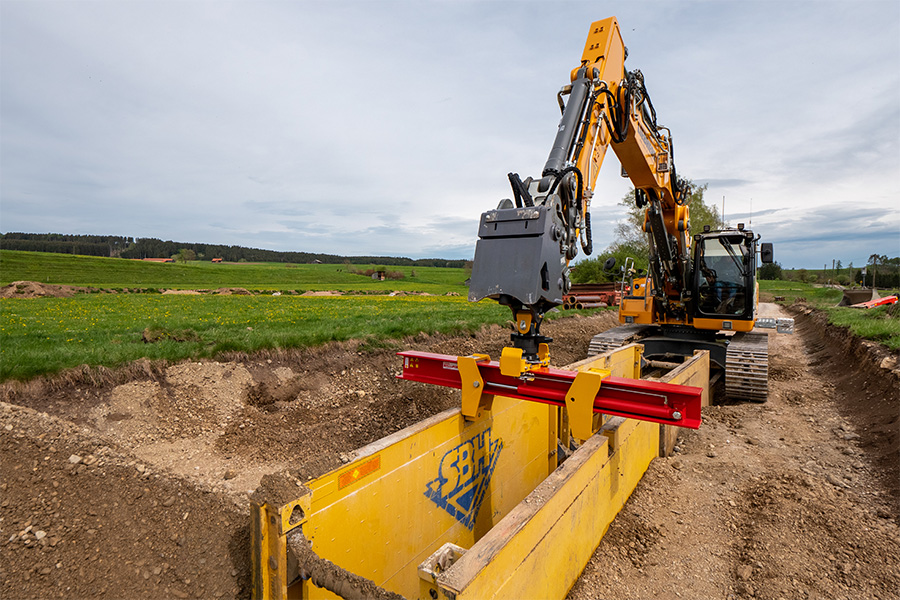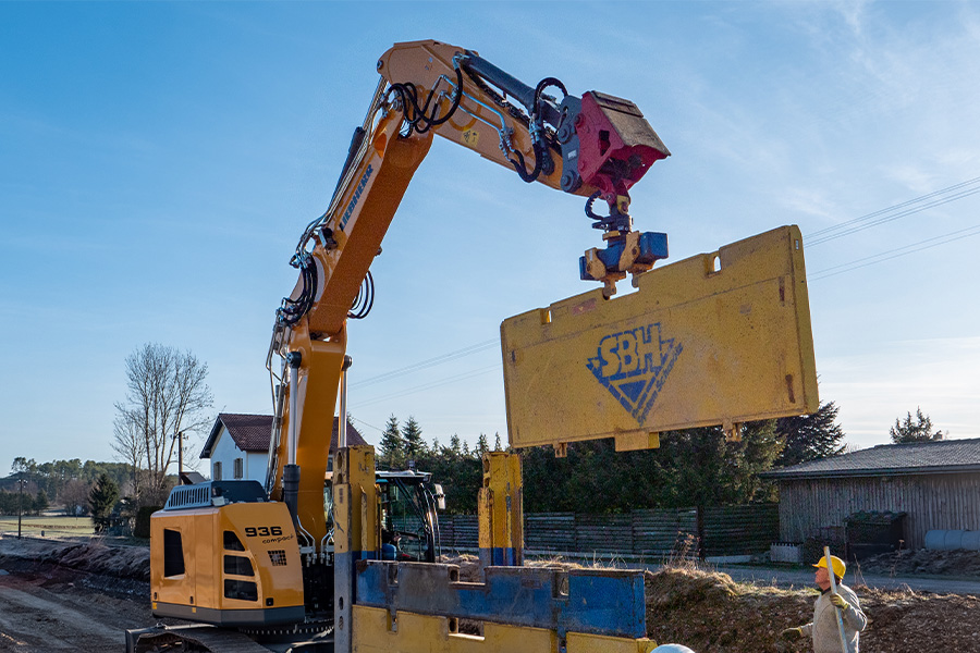 Der vollhydraulische Verbaugreifer ist das wichtigste Hebezeug zur Erhöhung der Wirtschaftlichkeit im Umgang mit Verbauboxen! Das gesamte Handling der Verbauboxen (Transport, Ein- und Ausbau) erfolgt mittels Verbaugreifer, allein durch den Maschinisten. Der Maschinist nimmt die Verbaubox in der zusätzlichen mittleren Aufnahmebuchse mit dem Greifer auf und kann sie durch den integrierten 360-Grad-Drehmotor exakt positionieren.