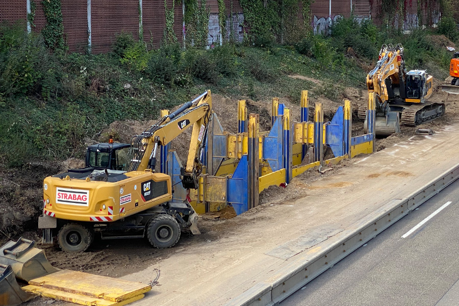 Durch die modulare Bauweise werden nur einzelne Verbauteile sukzessive Stück für Stück in das Erdreich eingebracht, deren Einzelgewicht zum Teil erheblich geringer sein kann als groß dimensionierte Boxensysteme für vergleichbare Tiefen. Bei fortschreitendem Rückbau werden ebenfalls lediglich einzelne Verbauplatten und Verbauschienen beziehungsweise Komplettrahmen gezogen. Dadurch reduzieren sich hier die notwendigen Zugkräfte erheblich. Das Gleitschienensystem kann sowohl in einer Verbaustrecke als auch für punktuelle Baugruben in Form einer vierseitig geschlossenen Baugrube verwendet werden. Mehr dazu finden Sie unter: Sonderbauwerke.