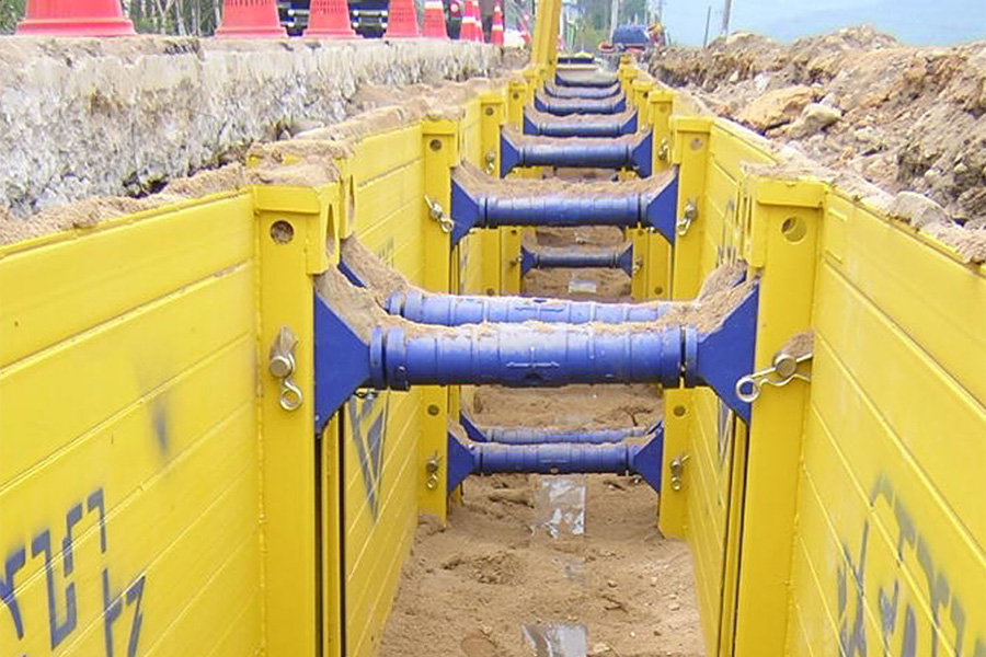 Die Leichtbox kombiniert die gelenkig gelagerte Spindel aus der Standardboxen-Serie mit der leichten Plattenkonstruktion des Leichtverbaus. Durch robustere Seitenteile und die gelenkig gelagerte Spindel kann diese Verbaubox durch das Absenkverfahren auch in nicht standfesten Böden verwendet werden und bietet zusätzlich noch höhere Rohrdurchlässe und größere Grabenbreiten.