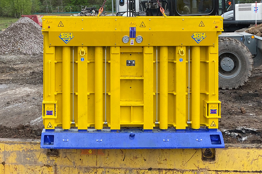 Die Verbaupresse ermöglicht den Ein- und Rückbau von Gleitschienenplatten selbst bei großen Tiefen und beengten Platzverhältnissen mit leichten Mobilbaggern. Dabei wird die Verbaupresse zuerst zug- und druckfest verbolzt. Anschließend presst der Zylinder mit bis zu 100 to die Gleitschienenplatte erschütterungsfrei und geräuscharm in das Erdreich.